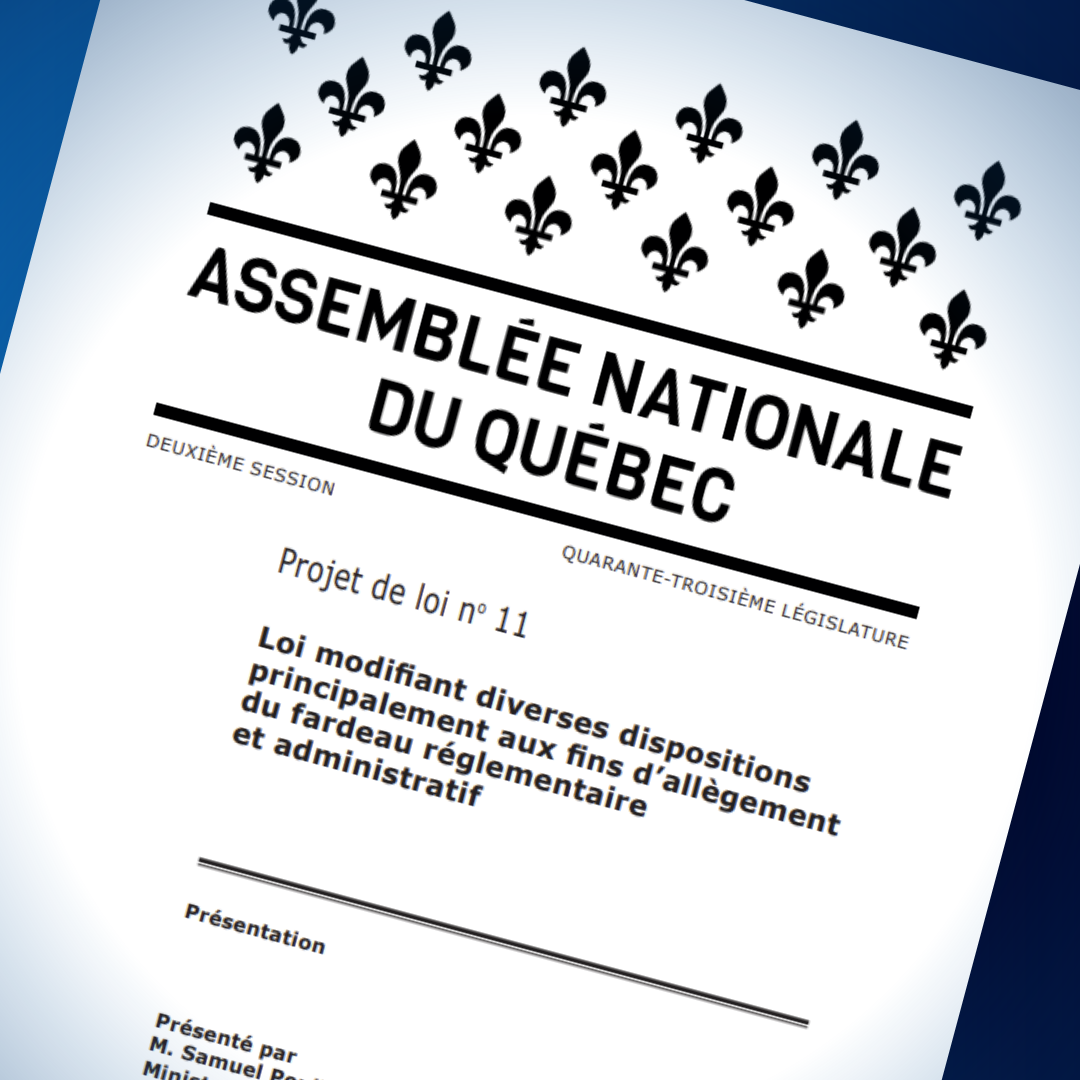 Le gouvernement du Québec a entrepris l’étude du projet de loi no 11, qui vise à modifier diverses dispositions principalement aux fins d’allègement du fardeau réglementaire et administratif des entreprises.